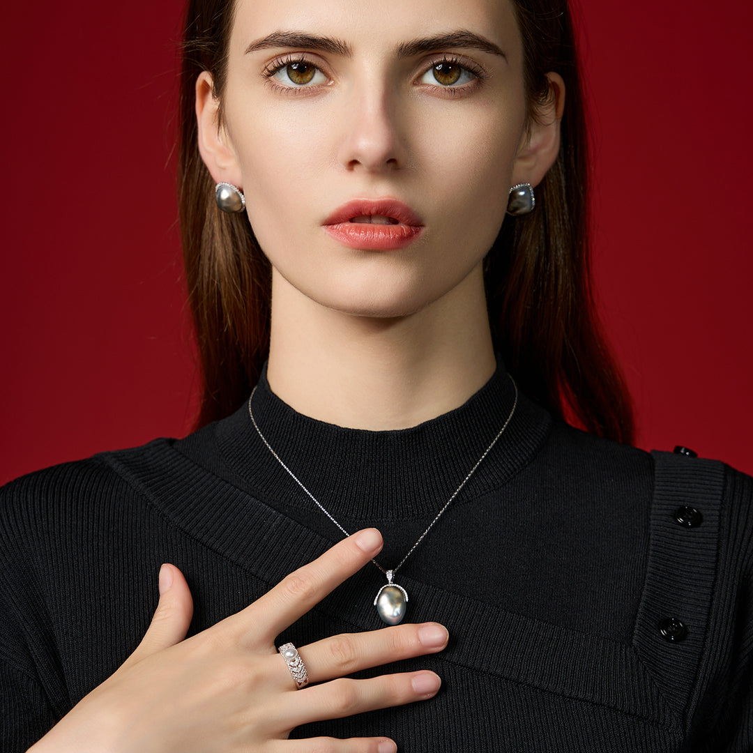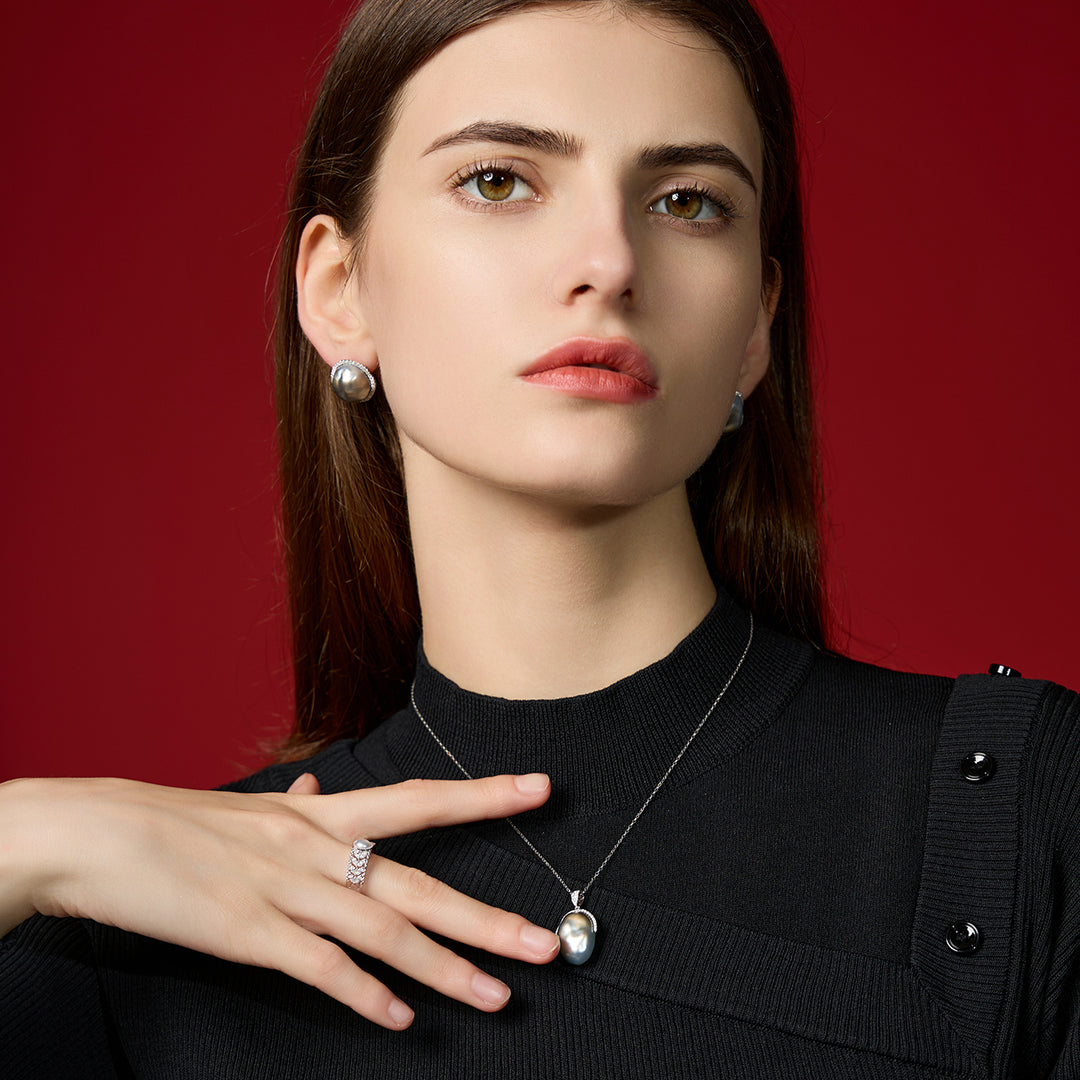 Manjakan diri dengan pesona warna Tahitian Keshi Pearl yang menawan, tingkatkan gaya anda. Mempunyai mutiara keshi berkilat 12-15mm yang dikelilingi oleh berlian yang berkilauan, anda akan kelihatan bergaya dan bergaya untuk sebarang acara besar.
