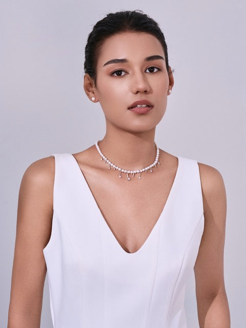 Mutiar air tawar mutiara air tawar yang mewah duduk dengan sempurna bersebelahan dan disambungkan oleh pengapit yang bergaya. Barang pernyataan ini menggambarkan keanggunan, kemewahan, dan kelas. Barang klasik yang tidak lapuk dek zaman ini adalah aksesori penting yang sesuai dipadankan dengan baju ketat atau gaun polos.