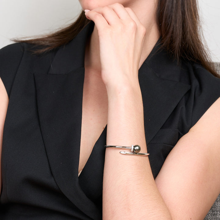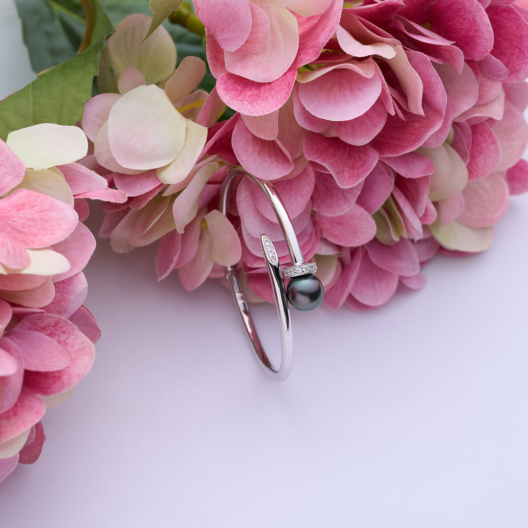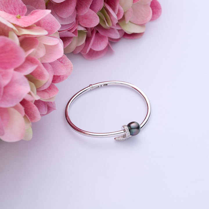 Kesederhanaan adalah segalanya dan gelang ringkas ini dengan hanya satu mutiara Tahitian berkualiti tinggi, sangat indah. Gelang ini menceritakan kisah gaya dan keanggunan. Ia unik dalam reka bentuk, perak sterling dengan reka bentuk lapisan emas, dan zirconia kubik di kedua-dua sisi mutiara tersebut.