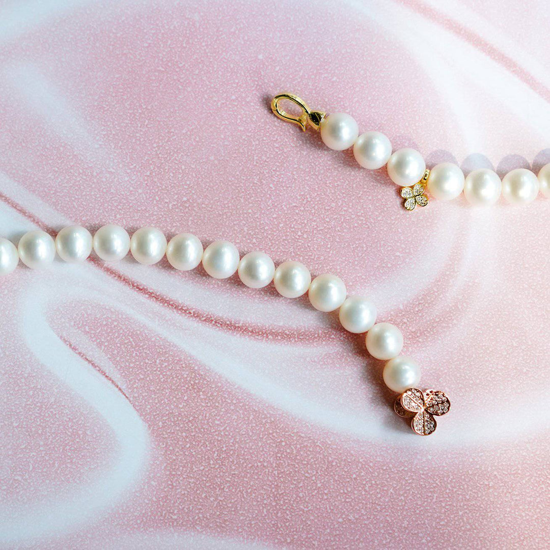 Gelang mutiara air tawar dengan kancing bunga dan zirkonia padu, reka bentuk yang indah, klasik sebenar, untuk wanita yang bergaya dan anggun. Gelang ini menunjukkan kelas dan tidak boleh dipakai dengan apa-apa kecuali - mungkin daya tarikan lain.
