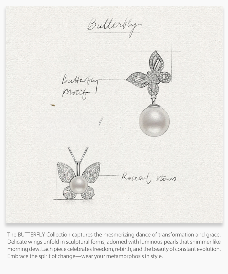 Kalung rama-rama dipadankan dengan mutiara Akoya yang menakjubkan. Diinspirasikan oleh bandar taman, kalung ini menangkap inti dari pesona muda dan keanggunan tanpa beban.