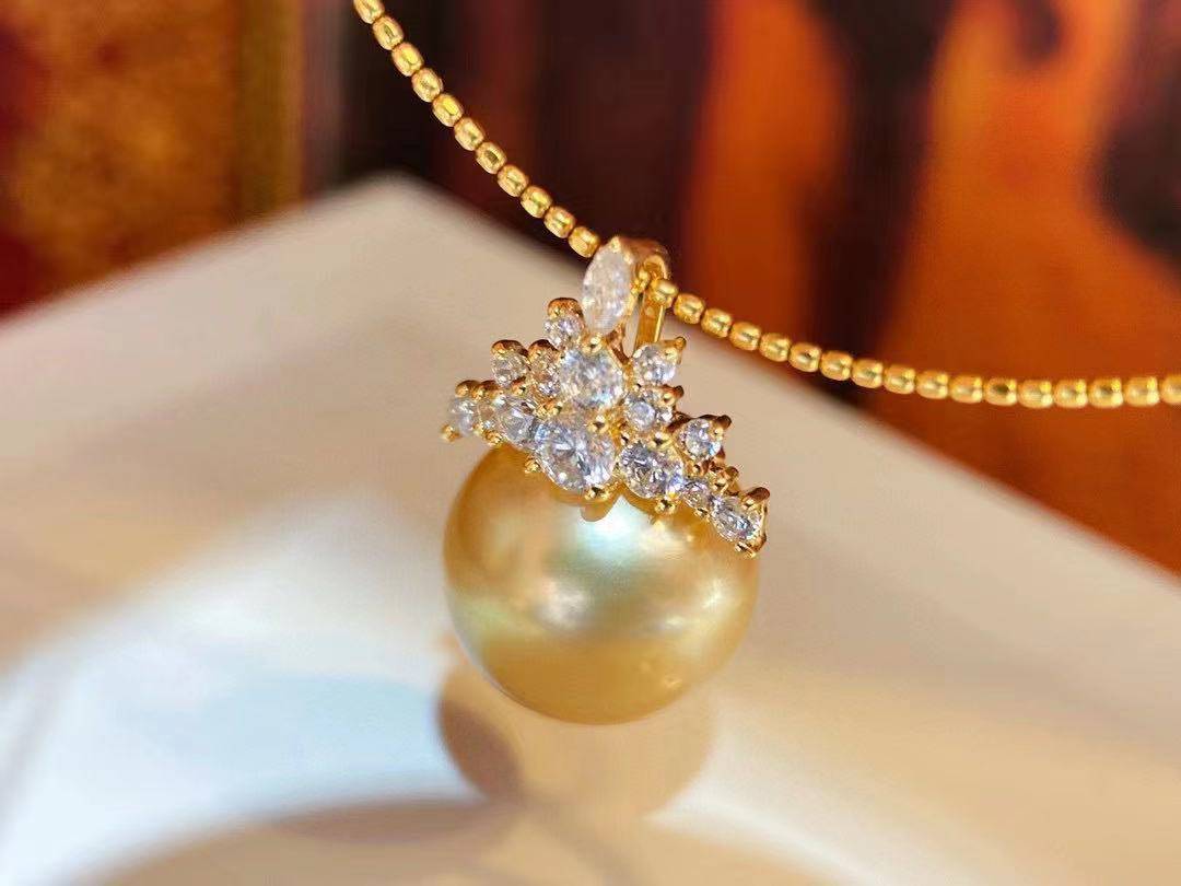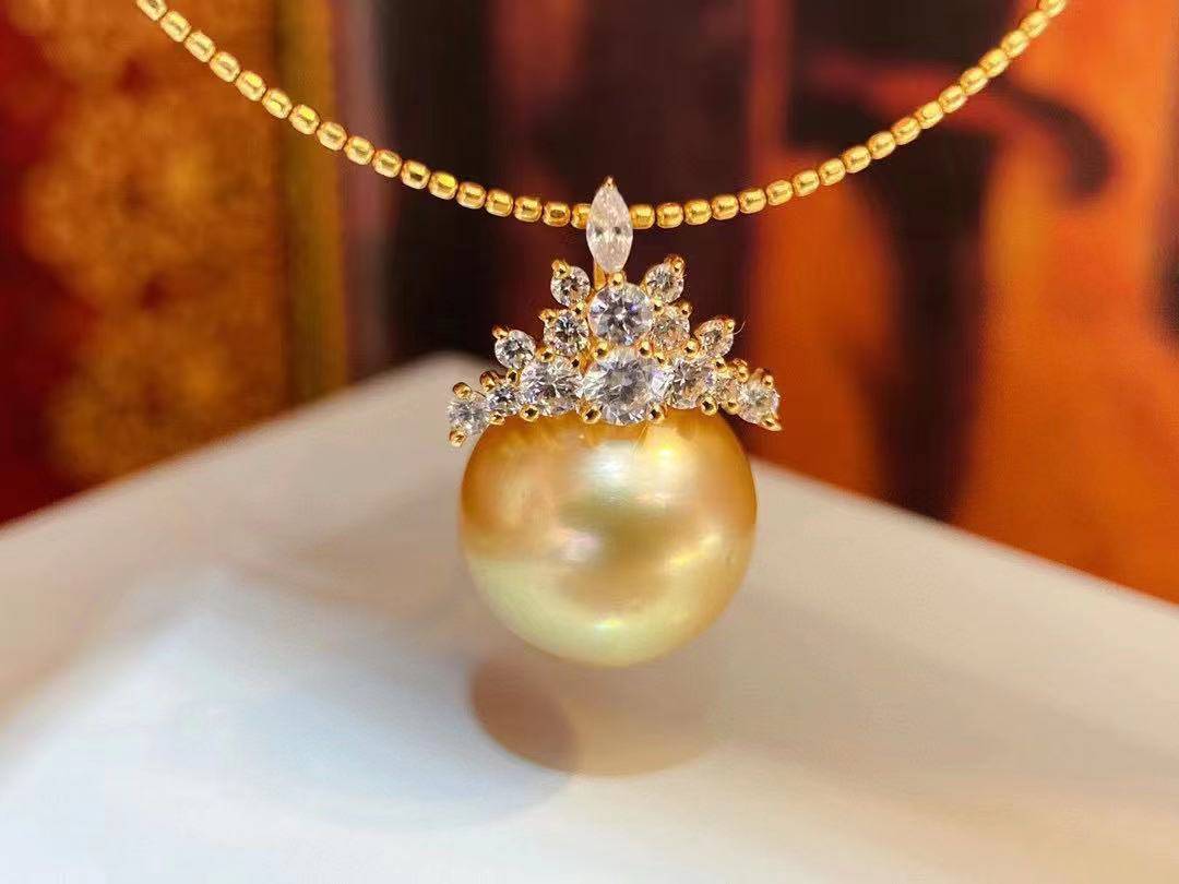 "อัญมณีที่เธอสวมใส่ล้ำค่าและหายาก และสร้อยคอไข่มุกทองสดใส สร้อยคอไข่มุก ที่เธอสวมอยู่บนคอของเธอ" สร้อยคอ ทองแท้ 18K ที่น่าทึ่งพร้อม ไข่มุกทองใต้ทะเลใต้ และ Cubic Zirconia ออกแบบให้ดูเหมือนมงกุฎบนไข่มุกเพื่อให้คุณเปล่งประกายเหมือนราชินีที่คุณเป็น".