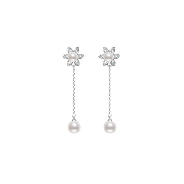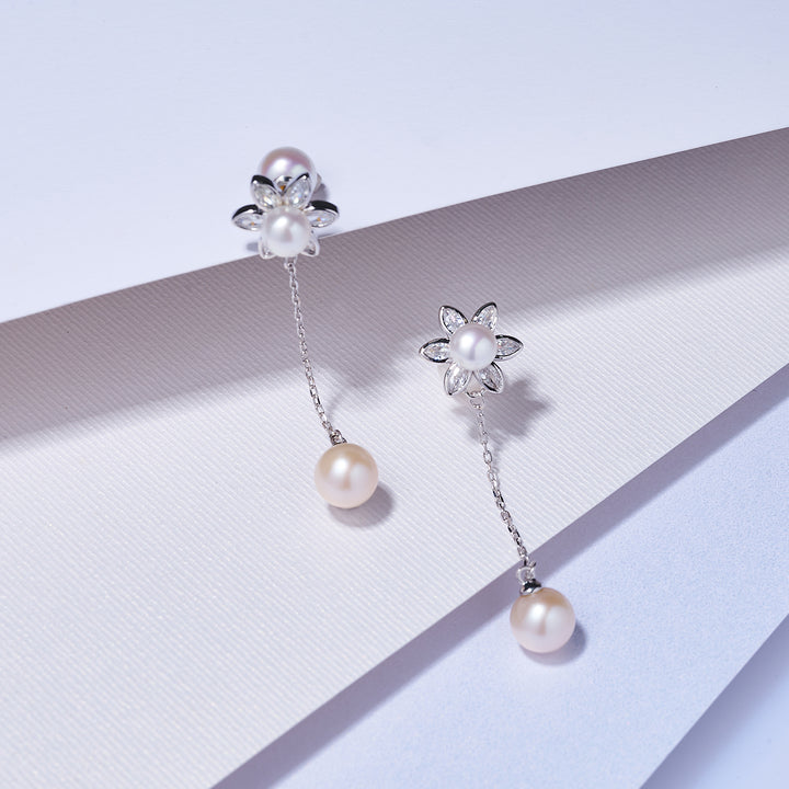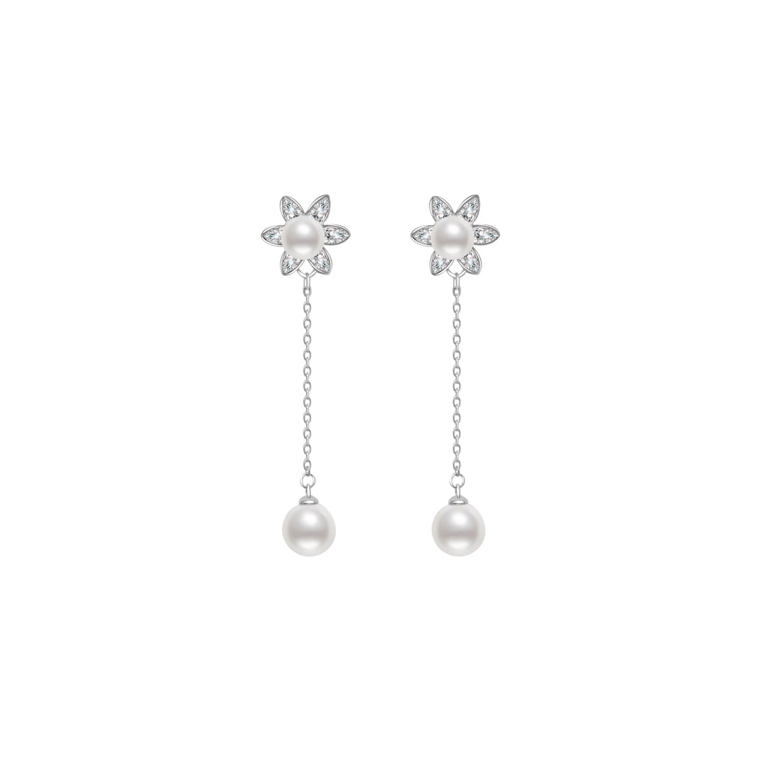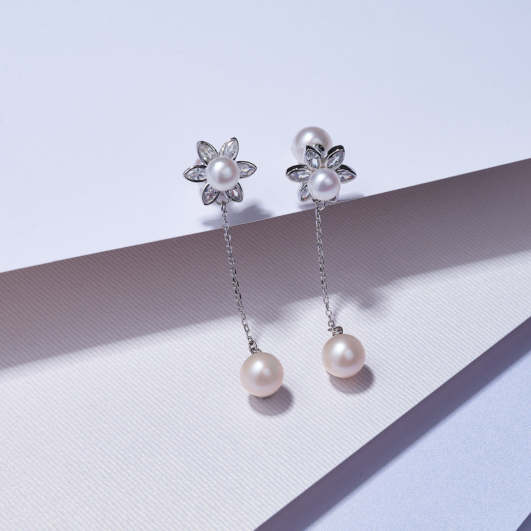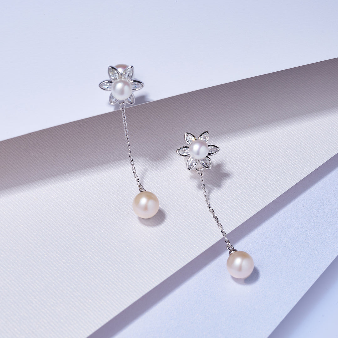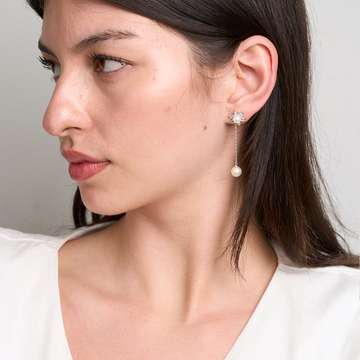 พลังแห่งดอกไม้เล็กๆ น้อยๆ ที่จะทำให้อารมณ์ของคุณดำเนินไปตลอดทั้งวัน เป็นเจ้าของต่างหูมุกห้อยระย้าประดับเพชรคิวบิกเซอร์โคเนียที่ดูเหมือนกลีบดอกไม้ ใส่ชุดนี้ได้ทั้งแบบลำลองหรือแบบทางการ
