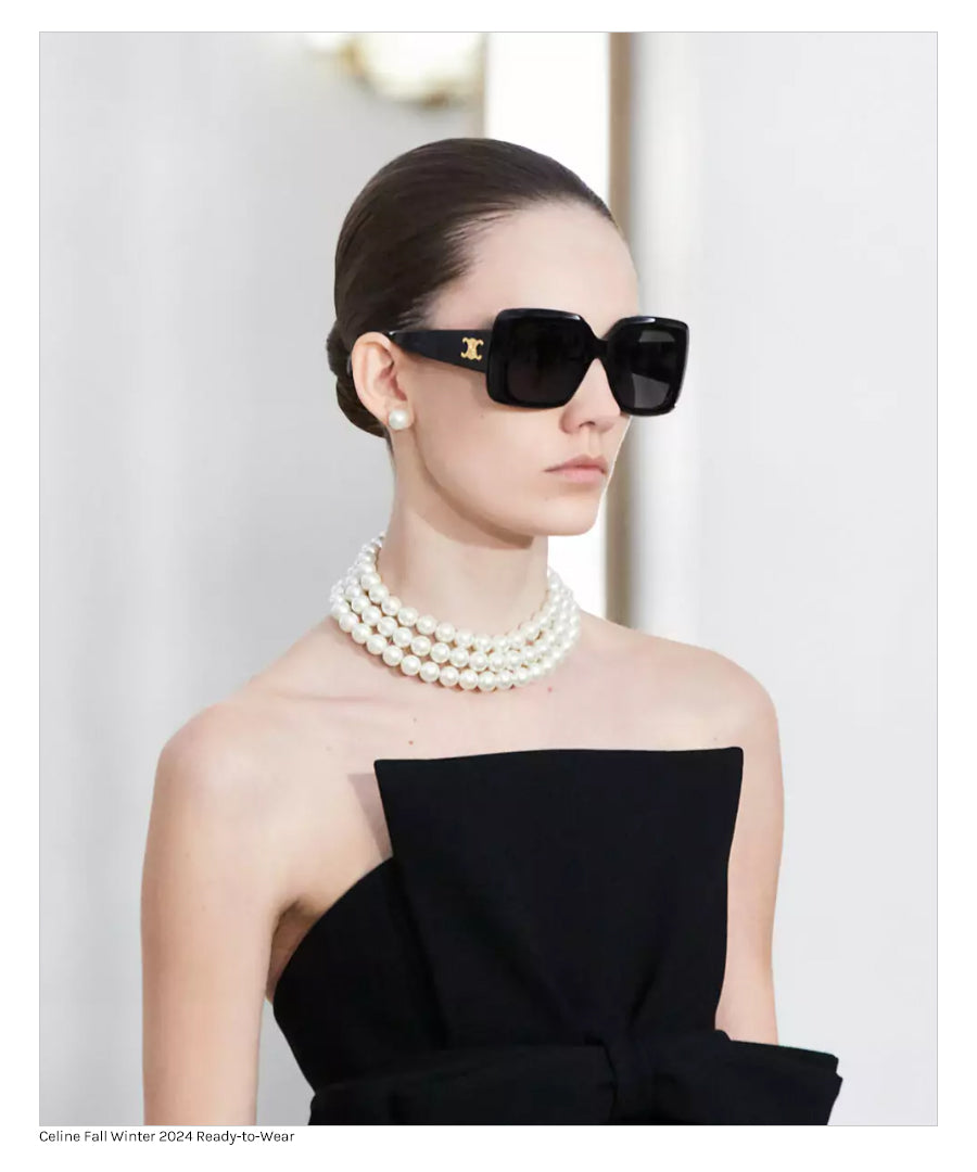 "“凯旋门系列”庆祝了Celine的黄金时代,回溯到六十年代并拥抱品牌的起源。一个突出特点是两件套装,令人联想到摇摆的六十年代,常配以多串珍珠颈圈,这种风格在那个时代深受伊丽莎白女王喜爱。这些颈圈提升了优雅感,传达出参加重要活动的氛围。珍珠作为当时最受珍视的珠宝之一,完美地衬托了时尚选择,为系列增添了深度和意义。"