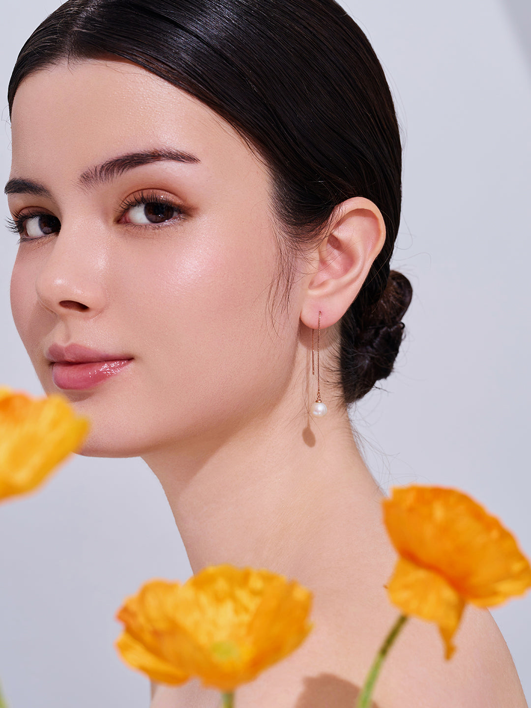 简约精致的垂坠珍珠耳环,适合优雅纯净的女性佩戴。无论是将头发束起还是别在耳后,都显得华丽动人。淡水珍珠,镀18K金的纯银线,理想的晚餐约会配饰。