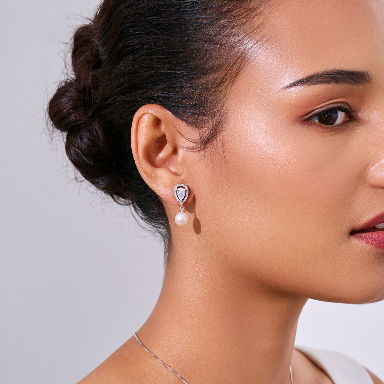 用这对美丽的珍珠吊坠耳环为您的造型增添一抹优雅与精致。