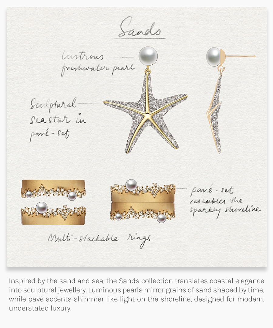 Sands Collection 灵感源自圣淘沙海滩的金色海岸——庆祝阳光亲吻的自由、轻松的美丽,以及自信拥抱生活和夏天的女性的感性精神。