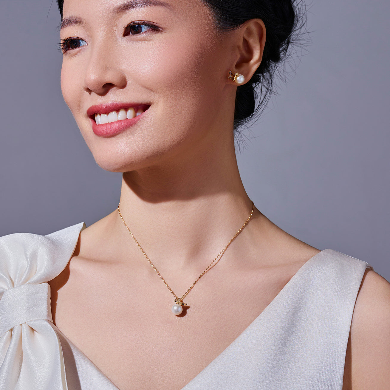 森林蝴蝶邂逅淡水珍珠。这套饰品捕捉了蝴蝶在奢华花园中的身影,花园与迷人的海洋和河流无缝连接,几乎如同魔法一般。搭配一袭美丽的白色飘逸长裙和这条蝴蝶珍珠项链,效果绝佳。
