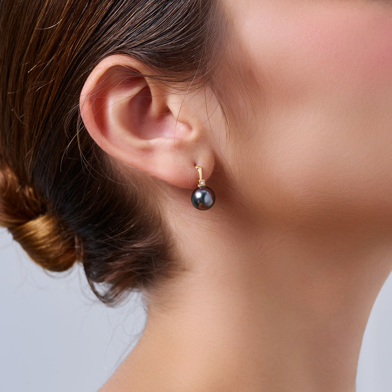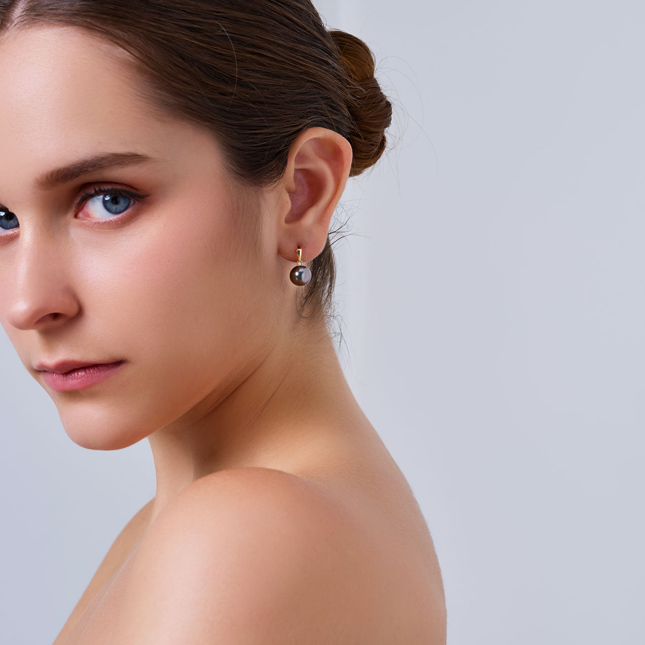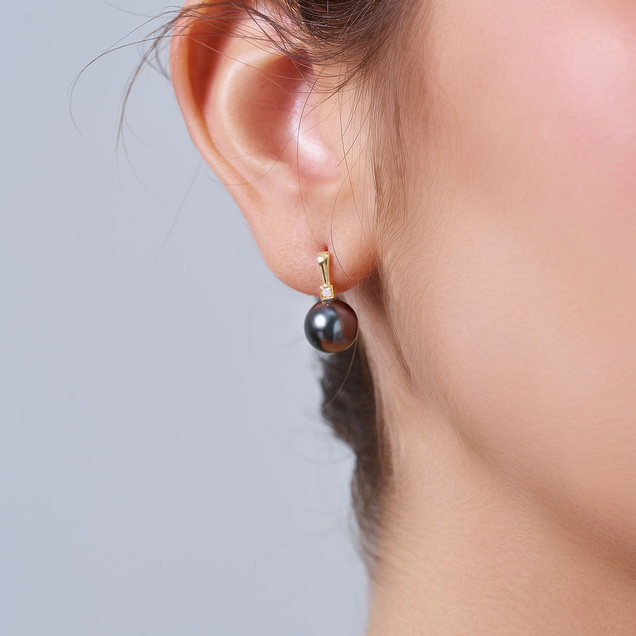 沉醉于大溪地珍珠耳环的光辉中。这些镶嵌钻石的18K黄金宝石散发着魅力与优雅,呈现迷人的外观。