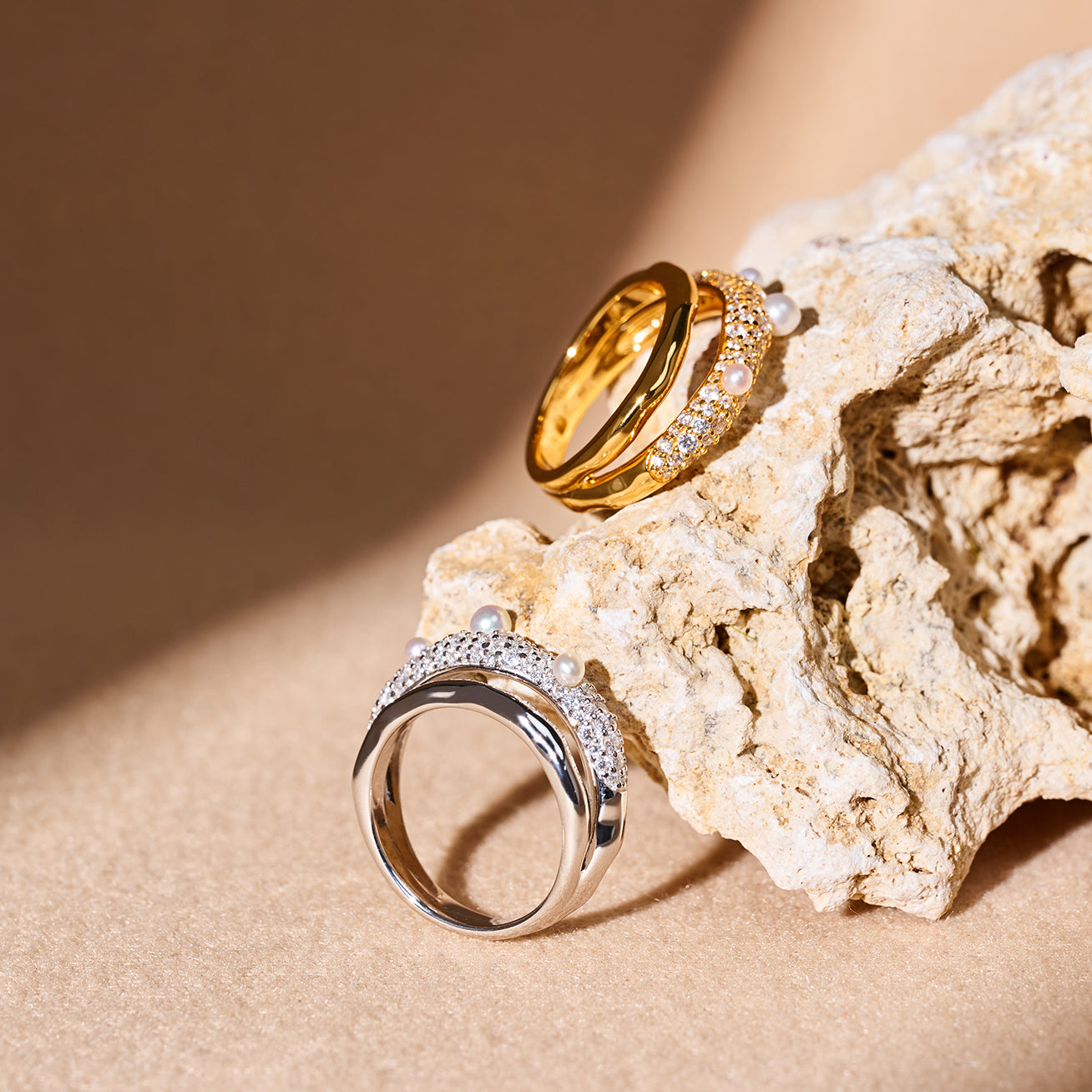 SANDS 系列 — 靈感來自聖淘沙的金色海岸,這款宣言戒指捕捉了陽光沙灘與光澤珍珠的閃耀。非常適合晚間造型或現代日常佩戴,讓您在每一個動作中都自信、優雅且光彩照人。
