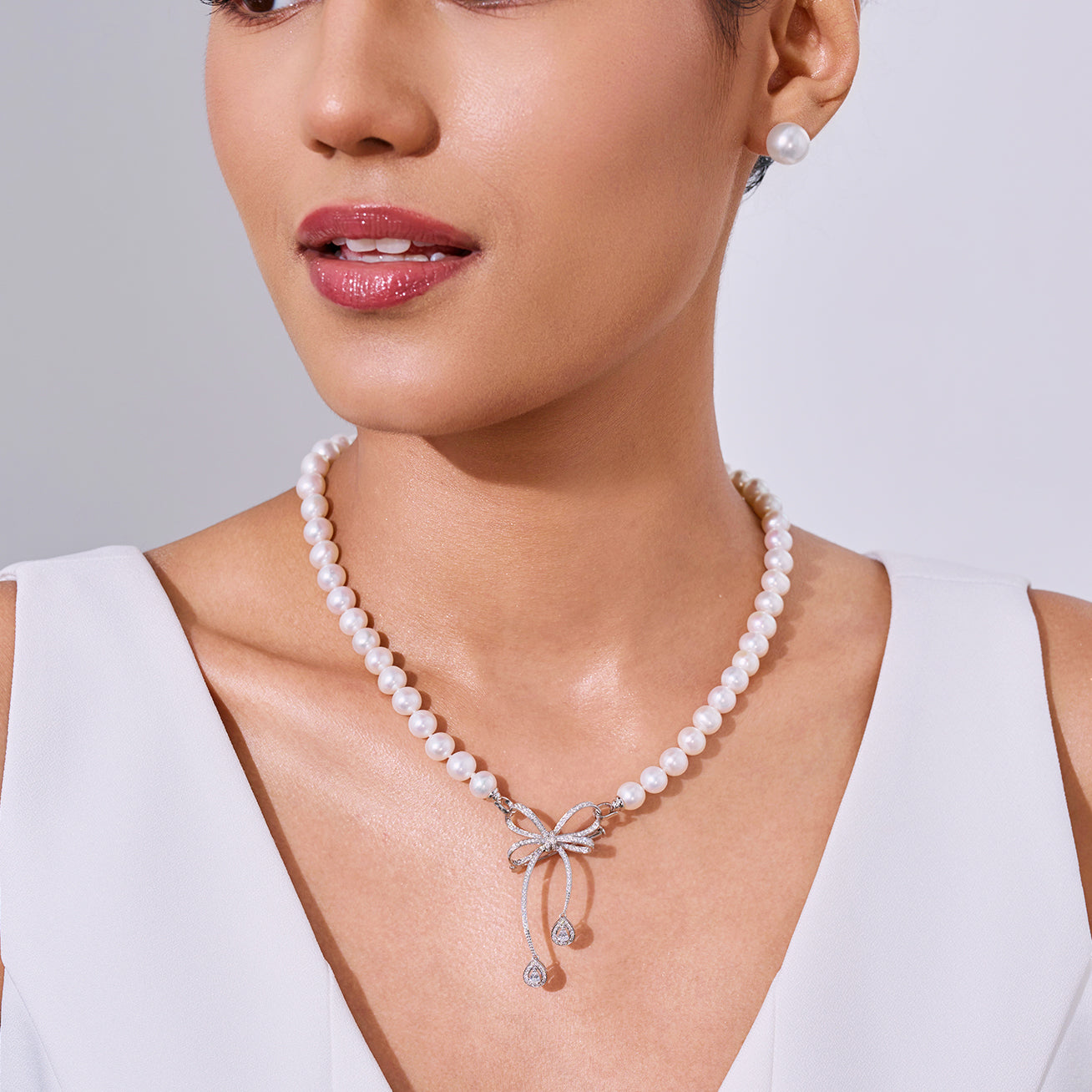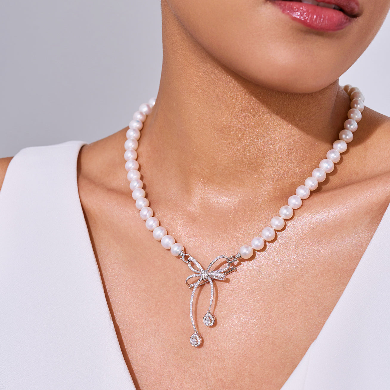 這款奢華的18K 珍珠項鍊以精緻細膩的工藝打造,採用淡水珍珠,並配有閃耀的立方氧化鋯緞帶蝴蝶結吊墜,亦可作為胸針佩戴。其經典設計為任何服裝增添優雅氣息,是正式晚禮服的理想搭配。