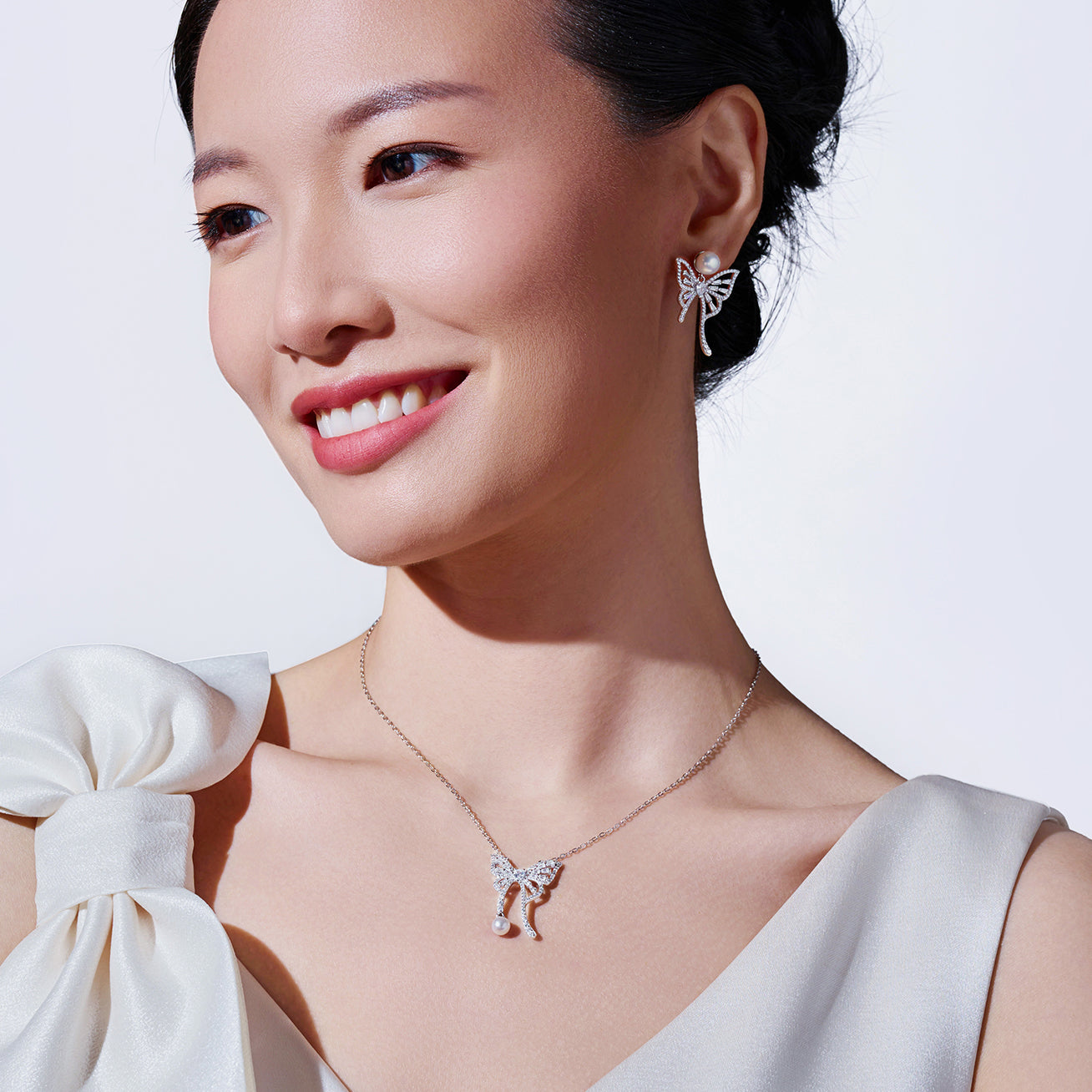 森林蝴蝶邂逅淡水珍珠。這組合捕捉了蝴蝶在奢華花園中,與迷人海洋和河流無縫銜接的景象,幾乎如同魔法般美妙。搭配美麗的白色飄逸長裙與這條蝴蝶珍珠項鍊,效果絕佳