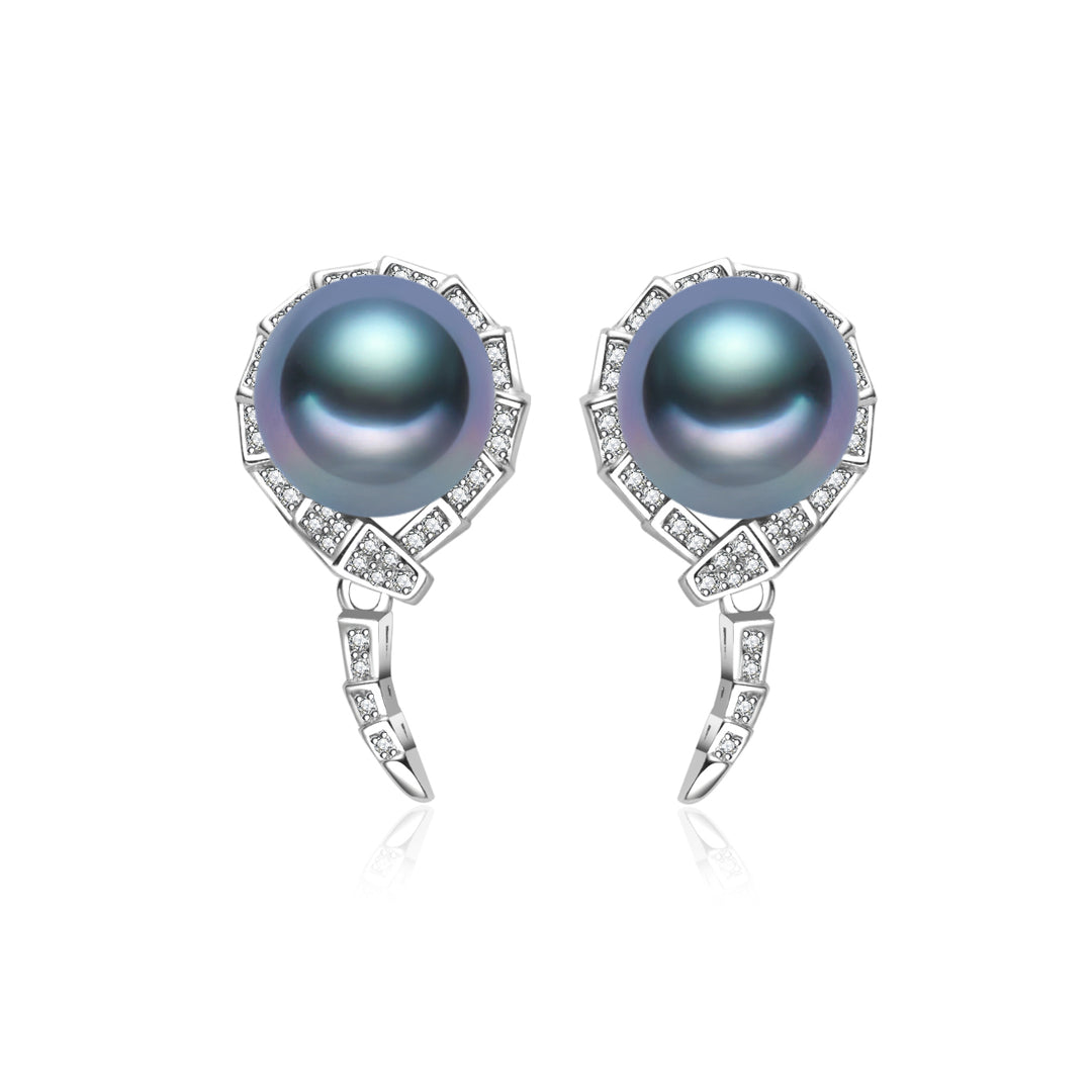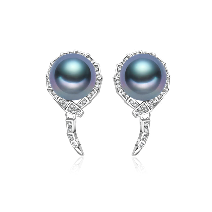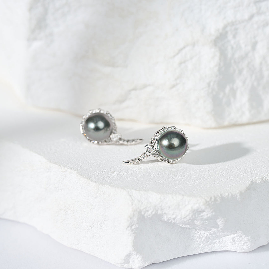 一对引人注目的大溪地珍珠耳环,拥有流畅的蛇形曲线——大胆、现代且轻松奢华。