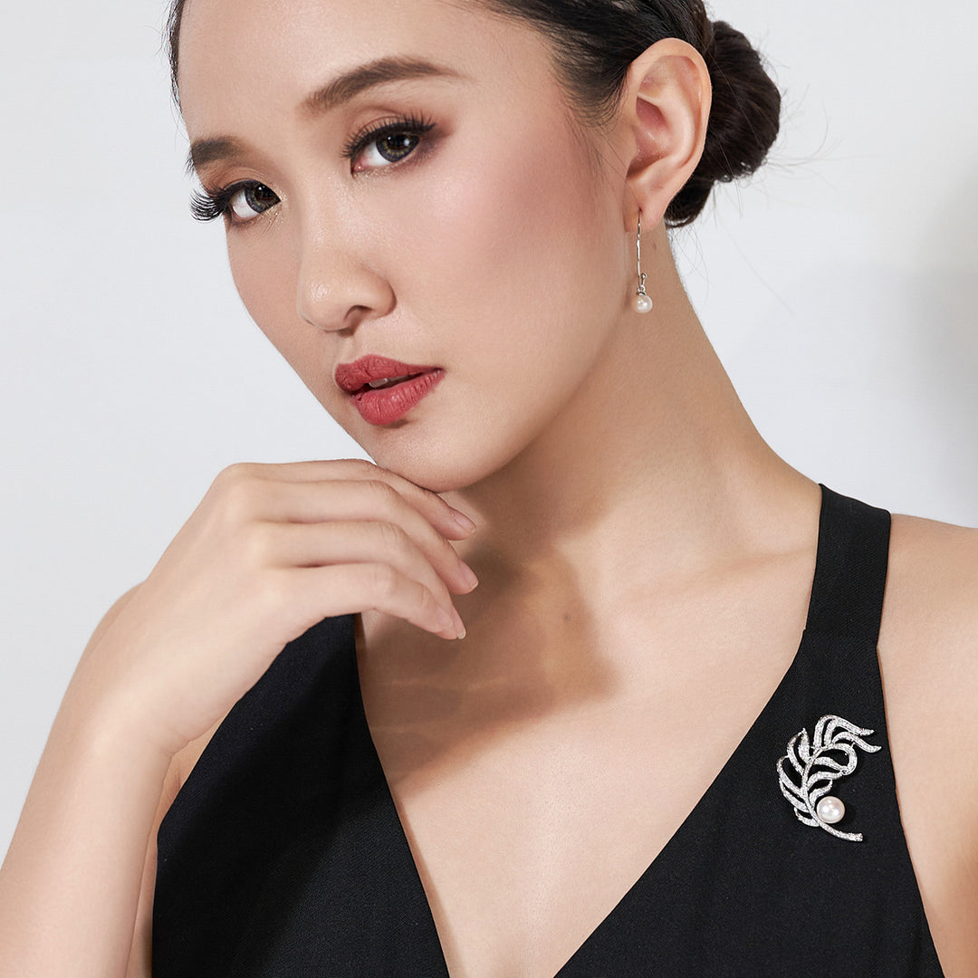这款胸针采用装饰性羽毛设计,是为您的服装增添自然美感的完美选择。它由9-10毫米的淡水珍珠和立方氧化锆制成,为这件作品增添了更多的闪耀。
