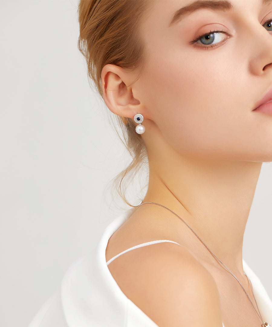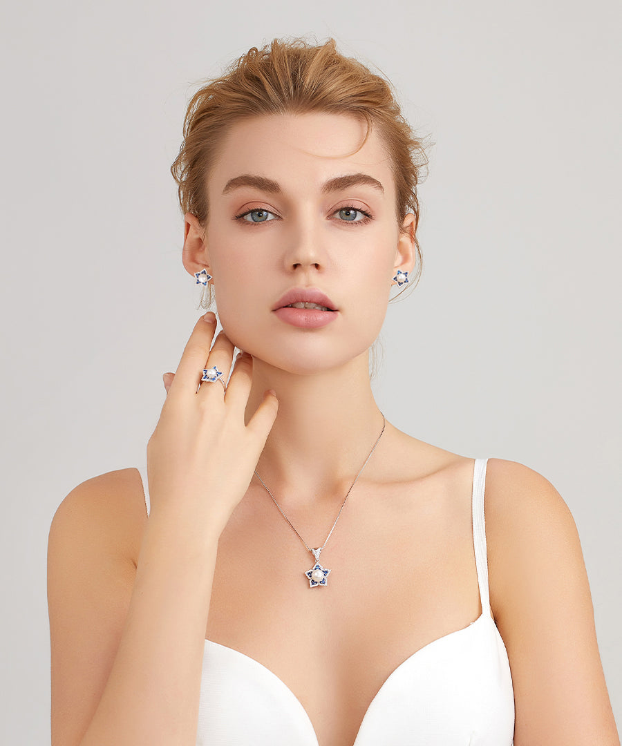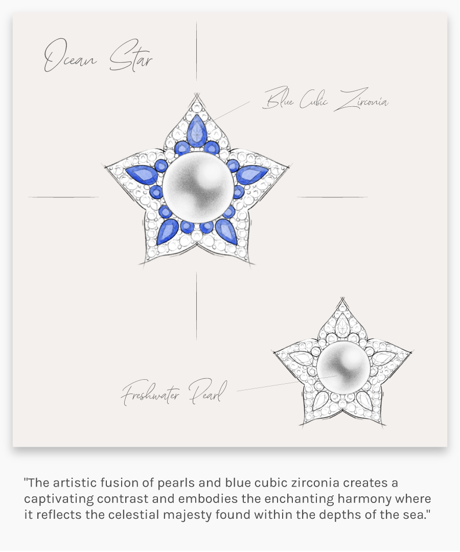 午夜海洋庆祝这两个领域的神圣结合。海洋珍宝——珍珠,唤起水下世界的神秘魅力,而飘逸的蓝色立方氧化锆则折射出天体的光辉。拥抱天空与海洋交汇处的迷人美景,永远捕捉这些精美的宝石。